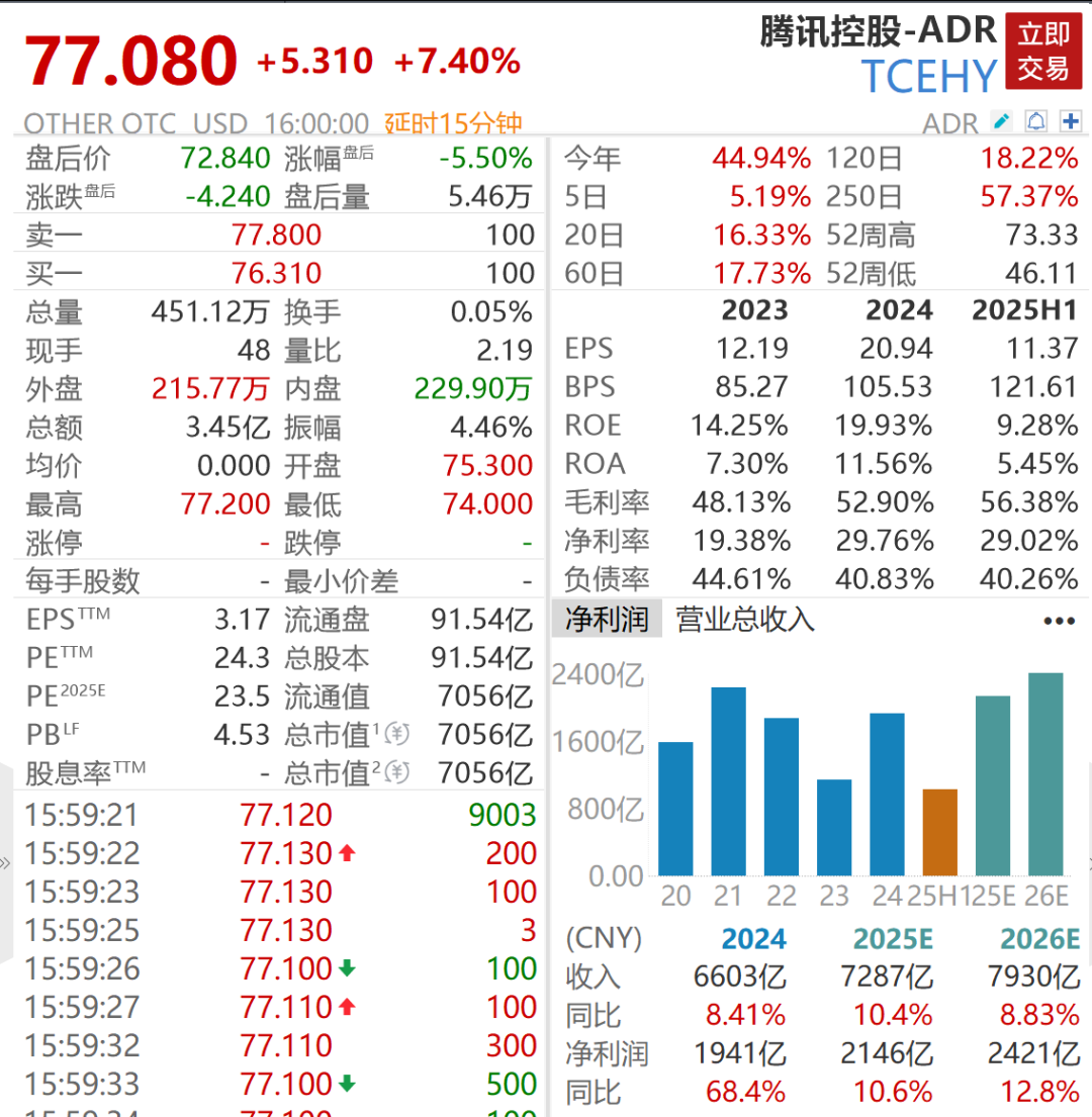 腾讯控股ADR涨超7%,创下逾四年以来的新高。 消息面上, 8月13日盘后,腾讯控股发布2025年中期及第二季度业绩报告, 腾讯控股第二季度收入同比增长15%至1845亿元,超出市场预估的1789.4亿元;净利润556.3亿元,同比增长17%。 (详见→)